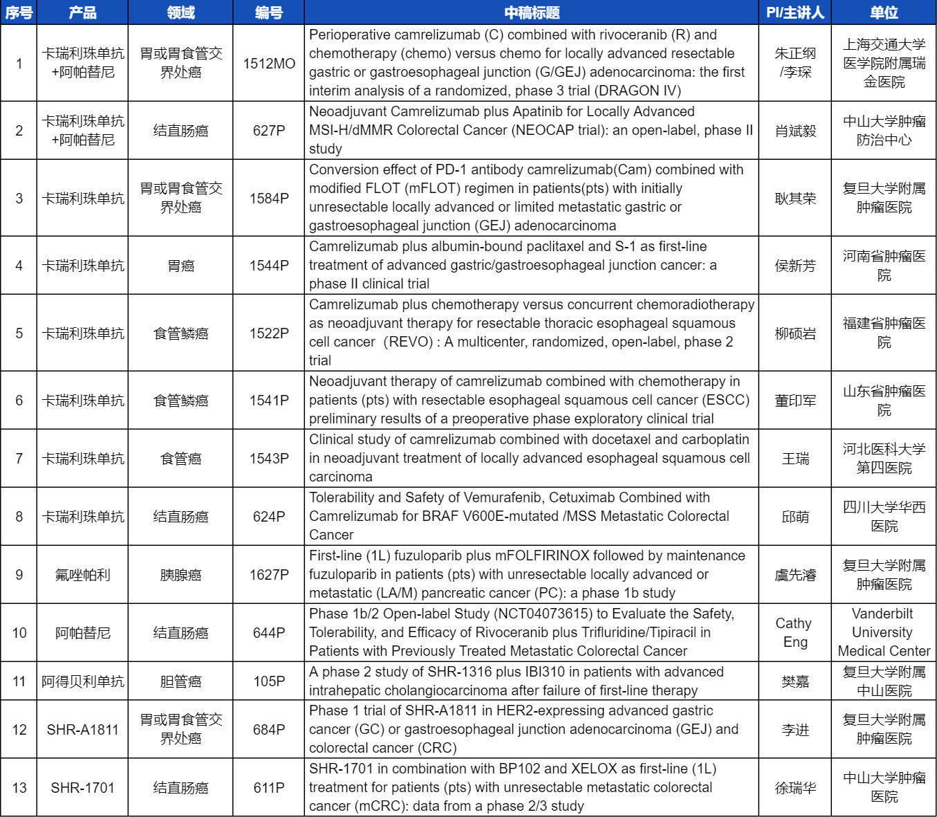 在消化系统肿瘤领域,GA黄金甲创新产品相关研究共入选1项口头报告和12项壁报展示。除了经典的明星药物卡瑞利珠单抗和阿帕替尼,SHR-A1811、SHR-1701等未上市创新产品也有相应研究入选。此外,阿得贝利单抗、氟唑帕利等已上市药物也在积极探索新的适应症,本次ESMO大会分别有肝内胆管癌和胰腺癌相关研究入选。这些新老药物前沿研究的不断出现,有望为消化系统肿瘤患者带来新的福音!